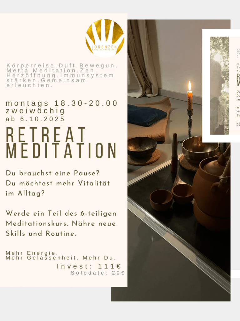 Meditation beruhigt nicht nur den Geist, sondern stärkt auch das Immunsystem, fördert tiefe Entspannung, öffnet das Herz und schafft Klarheit. Regelmäßige Praxis hilft, Stress zu reduzieren, gesunde Routinen zu entwickeln und im Alltag präsenter zu sein.