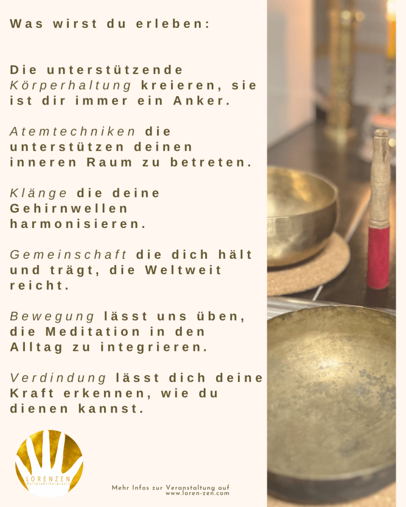 Es werden Grundlagen und verschiedene Techniken angeboten. Du kannst so deinen eigenen Meditationsweg starten, beleben oder mit anderen Menschen teilen.